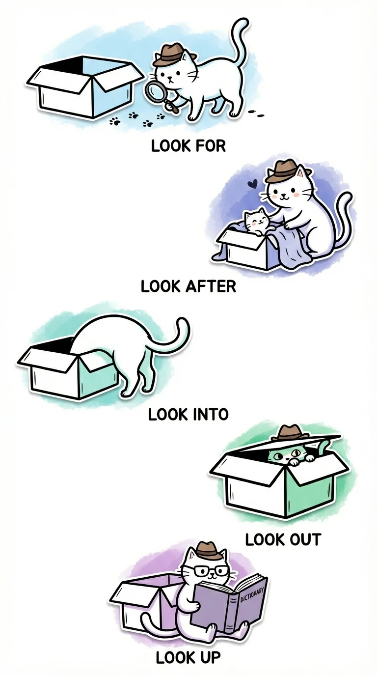 Illustration and examples for Look up, Look after, Look into, Look for and Look out
