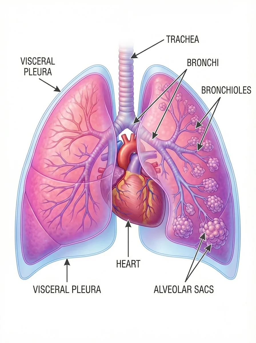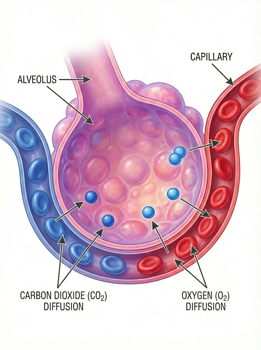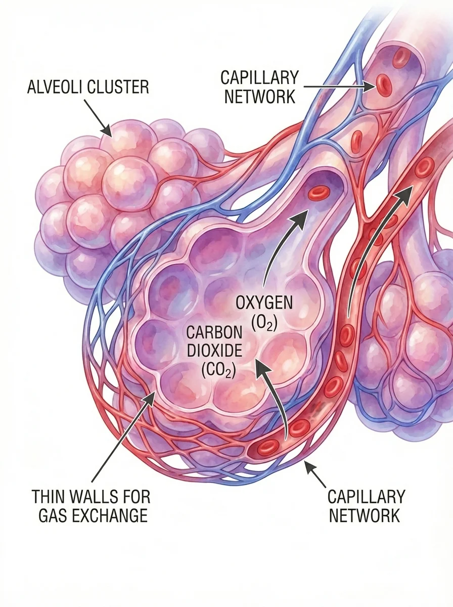 These tiny sacs are wrapped in blood vessels. The walls are so thin that oxygen and CO₂ can pass through easily.