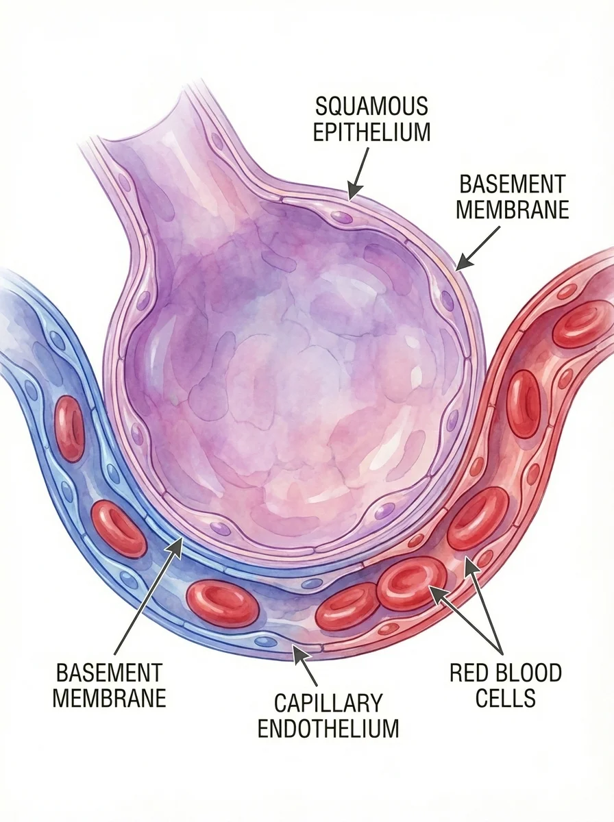 Three layers separate air from blood: (1) Alveolar wall (one cell thick), (2) Basement membrane (very thin), (3) Capillary wall (one cell thick). Total thickness: Less than 1 millimeter!
