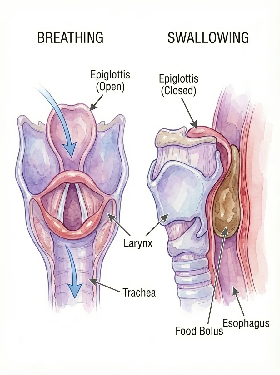 During breathing: Epiglottis is open, air flows to trachea. During swallowing: Epiglottis closes, food goes to esophagus.