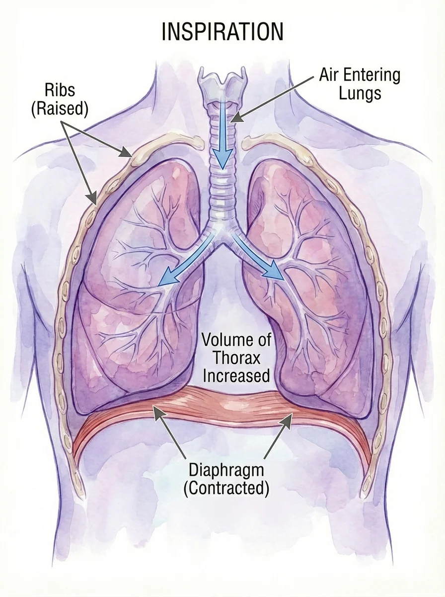 Diaphragm contracts and flattens. Ribs move up and out. Chest cavity expands. Pressure drops. Air flows IN.