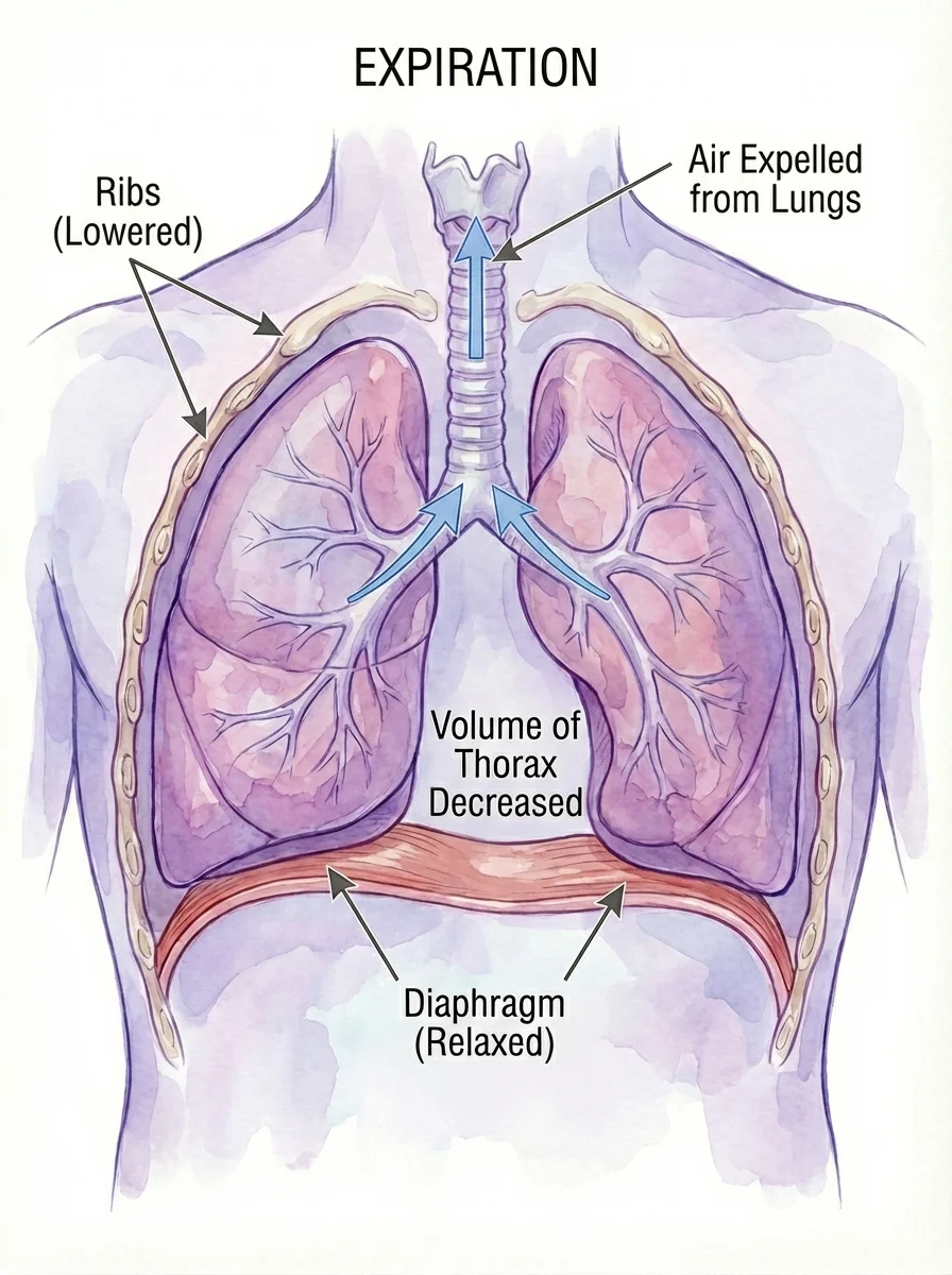 Diaphragm relaxes and domes up. Ribs move down and in. Chest cavity shrinks. Pressure rises. Air flows OUT.