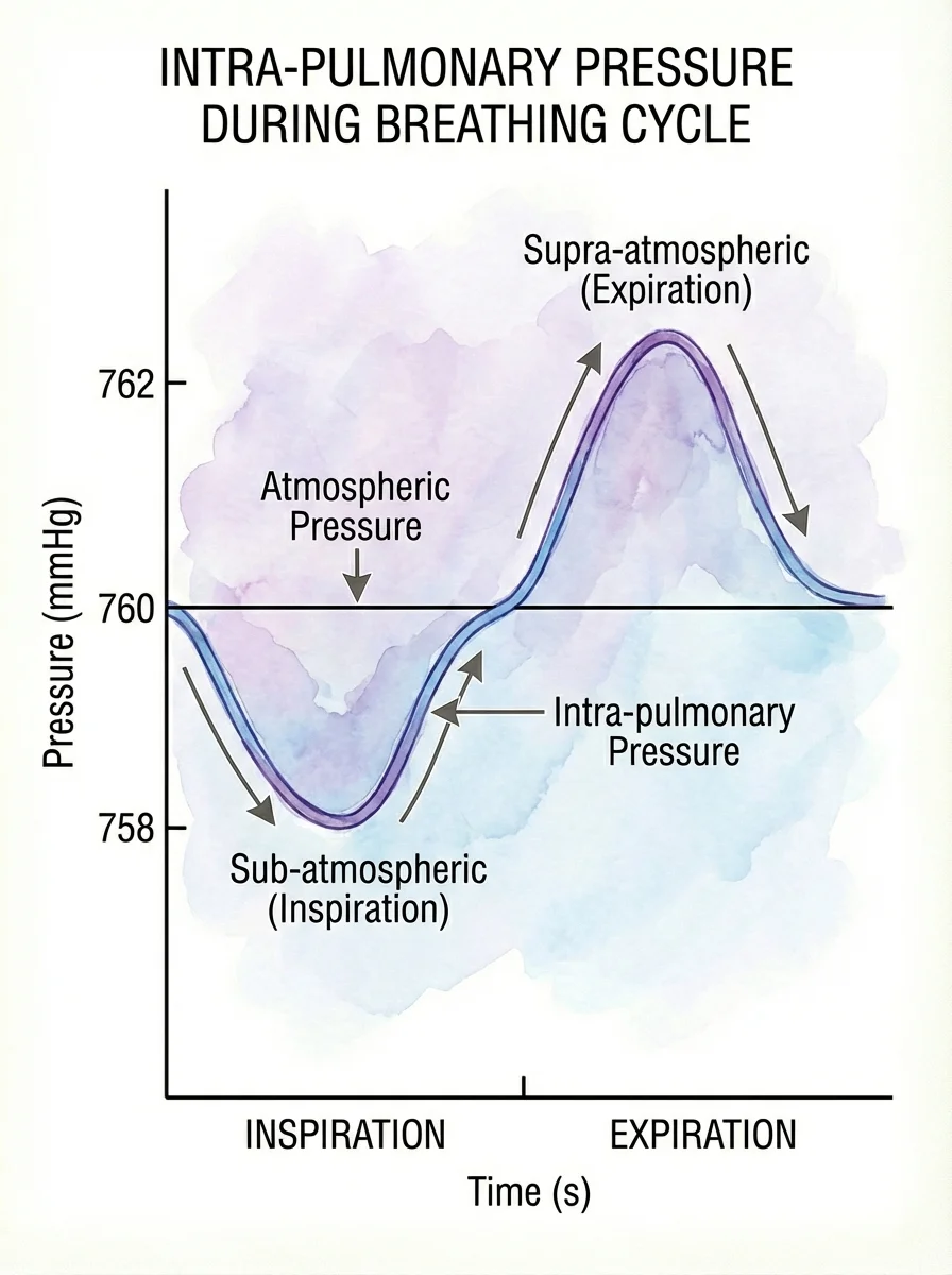 During inspiration, lung pressure drops below atmospheric. During expiration, it rises above atmospheric.