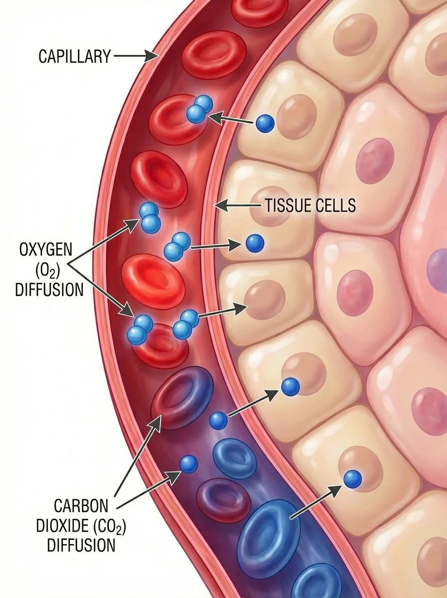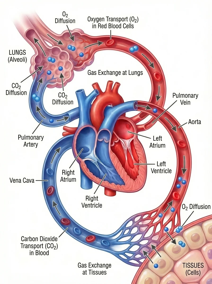 How O₂ and CO₂ move between lungs, blood, and tissues