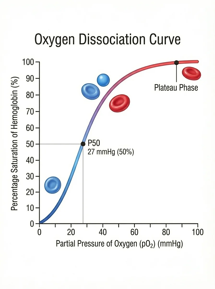 At lungs (pO₂ = 95-100 mm Hg), Hb is ~97% saturated. At tissues (pO₂ = 40 mm Hg), Hb is ~75% saturated. The S-shape shows cooperative binding - once one O₂ binds, others bind more easily.