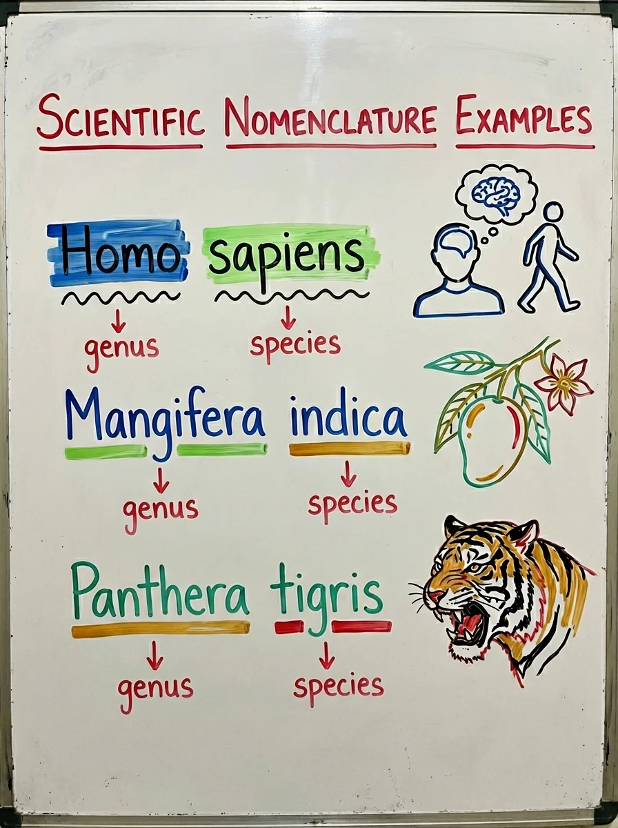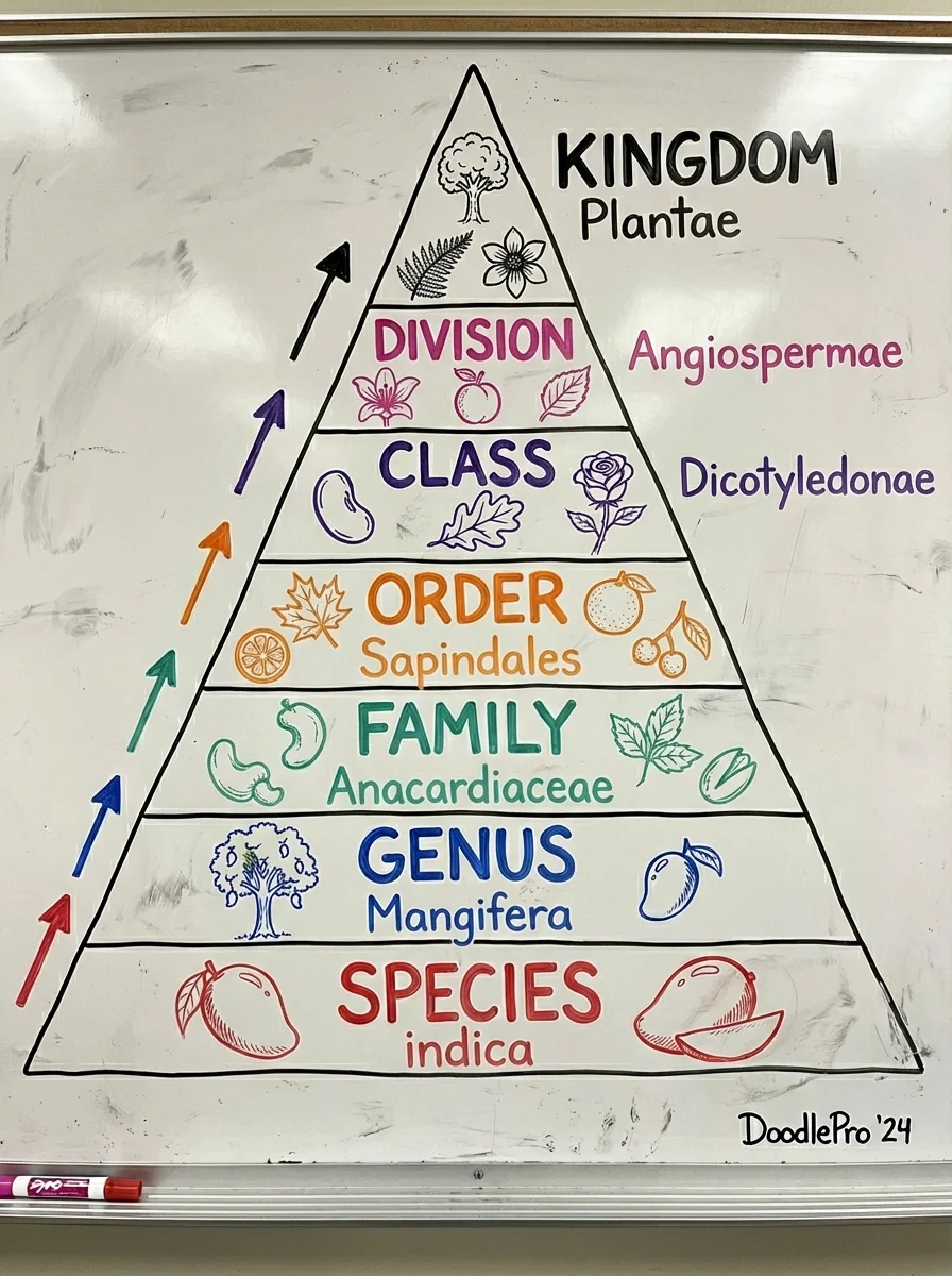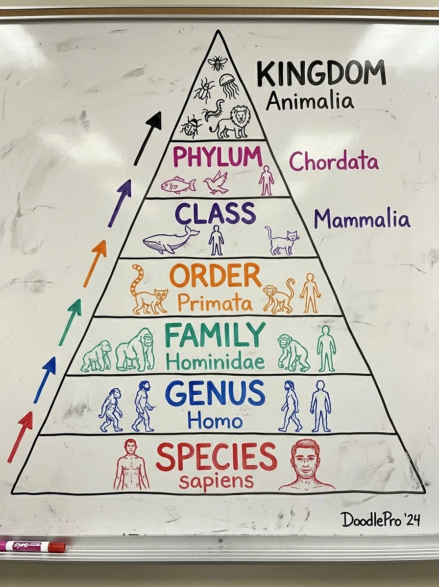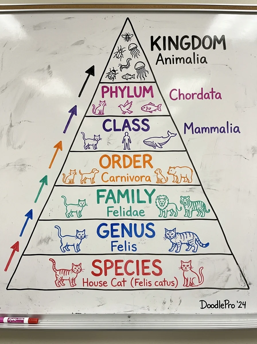 Bottom = Most specific (species). Top = Most general (kingdom). Going up means fewer shared characteristics.