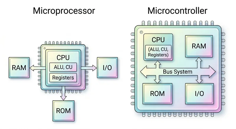 Side-by-side of microprocessor vs microcontroller chip structure.