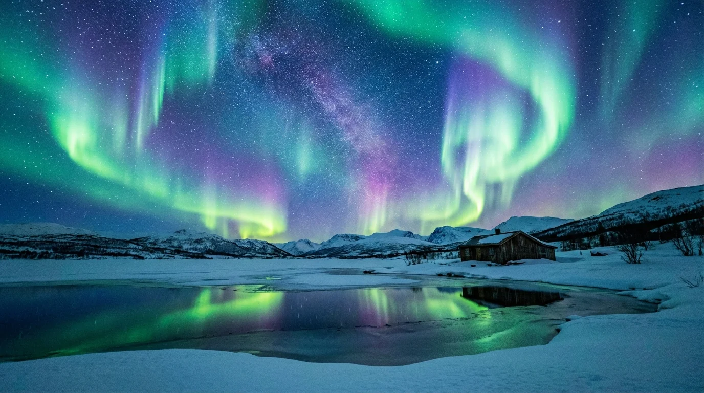 The aurora borealis paints Arctic skies with dancing curtains of green light.