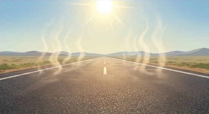 Hot roads shimmer as rising heat bends and wavers the light above them.
