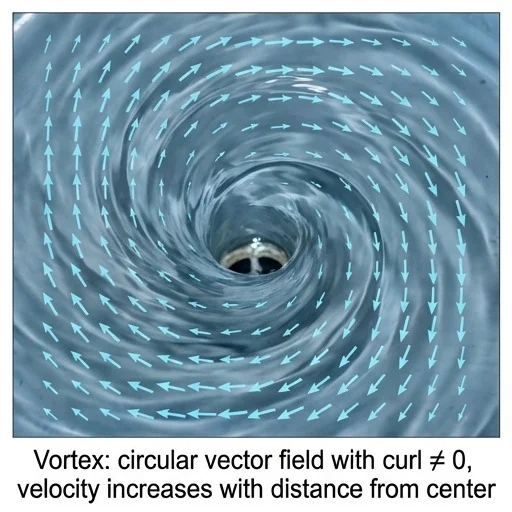 Vortex: circular vector field with curl ≠ 0, velocity increases with distance from center